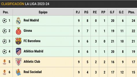 El Girona, por su parte, se mantiene firme en la clasificación con 22 unidades, después de haber ganado por la mínima al Cádiz (0-1). Los de Míchel siguen siendo el equipo revelación de esta temporada y quieren pelear por mantenerse en lo alto. En la cuarta plaza se ha quedado el Atlético de Madrid (19), con un partido menos, después de imponerse ante la Real Sociedad por 2-1.