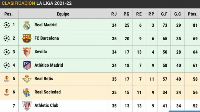 Con respecto al resto de la clasificación, el Real Madrid (campeón desde la J34) se ubica con 81 puntos en la primera posición, a la espera de la disputa de su partido contra el Atlético de Madrid este domingo a las 21:00 horas en el Wanda Metropolitano. Se esperan muchas rotaciones en el equipo dirigido por Carlo Ancelotti implemente varias rotaciones para dar descanso tras el 'milagro' ante el Manchester City.