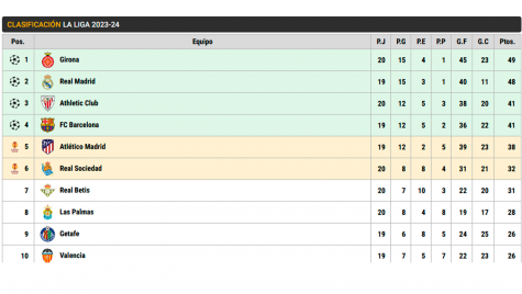 Con esta paridad, el combinado 'Gironí' alcanza un total de 49 unidades en 20 encuentros disputados. Tras este resultado, su más cercano perseguidor, el Real Madrid, se encuentra a solo un punto de diferencia (48) y con un compromiso menos. Hay que recordar que, al estar disputando la Supercopa, el duelo correspondiente a esta jornada para los merengues (contra el Getafe) será recuperado el primero de febrero, lo que podría permitirle, de obtener un resultado positivo, rebasar a los 'albirrojos' en la tabla clasificatoria.