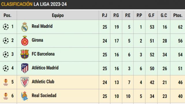 Así está la clasificación de LaLiga en la jornada 25