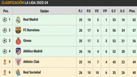El Barça se queda en la segunda posición una jornada más con 57 puntos, a la espera de lo que pase con el Real Madrid y Girona en esta jornada 26. La Casa Blanca recibirá al Sevilla, este domingo desde las 21:00 horas en el Santiago Bernabéu, mientras que los de Michel recibirán al Rayo Vallecano en Montilivi el día lunes. Supone más 'ansiedad' para los culés.