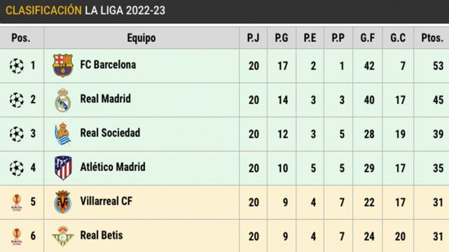 En la mitad de tabla están el Girona (24), Celta de Vigo (23), Valladolid (23), Almería (22), Espanyol (21), Sevilla (21) y Valencia (20), mientras que en la zona de descenso se mantienen el Cádiz (19), Getafe (18) y Elche (9).