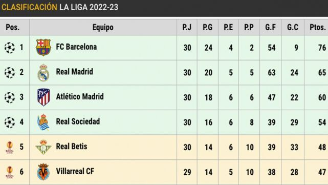 Como están las cosas, el FC Barcelona está en lo más alto de la clasificación con 76 unidades, por las 65 del Real Madrid. Sigue el Atlético, con 60 puntos, y la Real Sociedad que cierra la zona Champions con 54 unidades. El 'top 10' lo completan el Betis (48), Villarreal (47), Athletic (46), Osasuna (41), Rayo Vallecano (40) y Mallorca (40). En la mitad de la tabla se encuentran el Girona (38), Sevilla (38), Celta (36), Valladolid (35), Cádiz (32), Getafe (31) y Almería (31). En la zona de descenso, finalmente, se encuentran el Valencia (30), Espanyol (28) y, finalmente, el Elche (13).