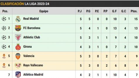 En esta quinta jornada del campeonato doméstico se han vivido muchas novedades y sorpresas en los resultados. El Rayo se impuso en casa ante el Alavés (2-0), al igual que el Athletic Club ante el Cádiz (3-0), así como la del Valencia sobre el Atlético de Madrid, que dejó 'KO' a los del 'Cholo' Simeone, mientras que el Mallorca tuvo que trabajar más de la cuenta para imponerse en su visita al Celta (0-1).