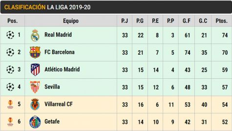 Los otros dos puestos de Champions League también parecen bastante definidos: el Atlético de Madrid lleva una gran racha y se sitúa tercero con 59, mientras que el Sevilla consiguió ganar su partido frente al Leganés y tiene 57. El conjunto de Julen Lopetegui consiguió frenar su racha de empates para evitar que el Villarreal (54 puntos) siguiese acercándose.