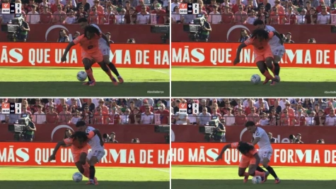 La jugada se produjo en el centro del campo, cuando el lateral sevillista arrolló al central francés en el momento en que este intentaba controlar el balón. El robo posterior permitió al conjunto andaluz lanzar un rápido contragolpe que finalizó con el 2-0. La acción generó una oleada de protestas entre los jugadores azulgranas y un monumental enfado en el banquillo de Hansi Flick.