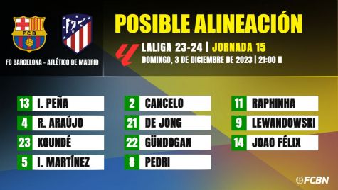 - XI del FC Barcelona: Iñaki Peña, Araujo, Koundé, Iñigo, Cancelo, De Jong, Gündogan, Pedri, Joao Félix, Raphinha y Lewandowski.