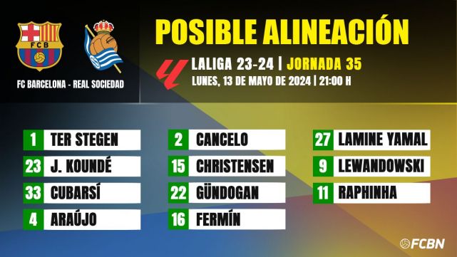 - XI del FC Barcelona: Ter Stegen; Koundé, Araújo, Cubarsí, Cancelo; Christensen, Gündogan, Fermín; Lamine, Lewandowski y Raphinha.