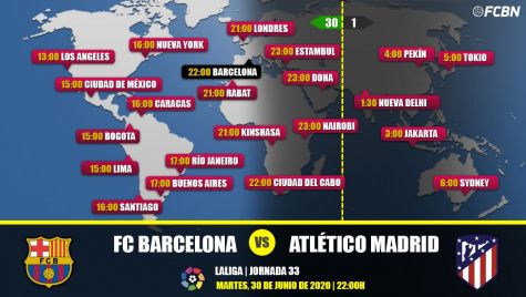 En España, el Barça-Atlético será televisado en directo el martes 30 de junio a las 22:00 horas por los canales Movistar LaLiga, Movistar LaLIga 1, M. LaLiga UHD, mitele PLUS y LaLiga TV Bar, a través de los operadores Movistar, Orange, Jazztel y Mitele, que ofrecerán el partido en Internet y con acceso desde tu móvil, tablet, ordenador o Smart TV.