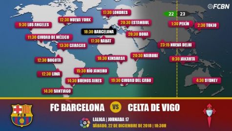 En España, el Barça-Celta será televisado en directo el sábado 22 de diciembre a las 18:30 horas por los canales beIN LaLiga (canal 47 de Movistar ), beIN LaLiga 4K y LaLiga TV Bar (canal exclusivo para locales públicos), a través de los operadores Movistar , Vodafone, Orange y Telecable, que ofrecerán también el partido en Internet y con acceso desde cualquier PC/MAC, tablet o smartphone.