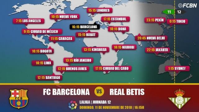 En España, el Barça-Betis será televisado en directo el domingo 11 de noviembre a las 16:15 horas por los canales beIN LaLiga y LaLiga TV (Bar), a través de los operadores Movistar , Vodafone, Orange y Telecable, que ofrecerán también el partido en Internet y con acceso desde cualquier PC/MAC, tablet o smartphone. Además, diferentes canales internacionales ofrecen ver el Barcelona-Betis de la jornada 12 de la Liga Española de Fútbol en directo a través de sus plataformas.