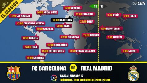 FC Barcelona y Real Madrid se enfrentan este miércoles 18 de diciembre, a las 20:00 hora española, en el Estadio del Camp Nou (Barcelona). El encuentro corresponde a la jornada 10 de LaLiga Santander 2019-2020 (partido aplazado), y enfrenta al Barça de Ernesto Valverde contra el Real Madrid entrenado por Zinedine Zidane. A continuación repasamos los horarios y dónde ver este partido de fútbol en TV.