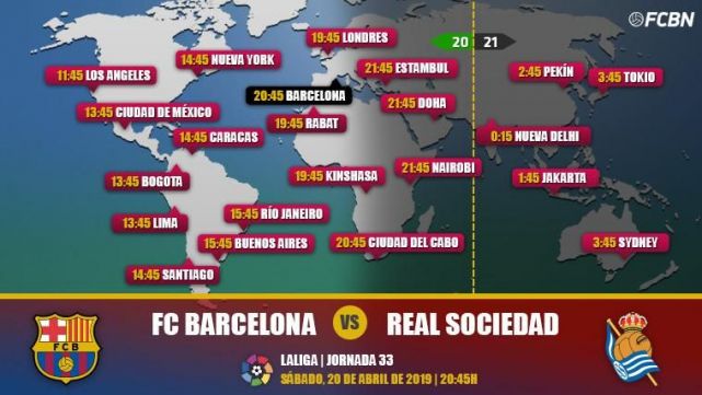 ¿Cuándo y dónde ver el partido FC Barcelona-Real Sociedad? Repasamos la guía internacional con los horarios y los canales de televisión que retransmiten en directo y online la jornada 33 de LaLiga Santander 2018-2019. En España, puedes ver el partido el sábado 20 de abril a las 20:45 horas