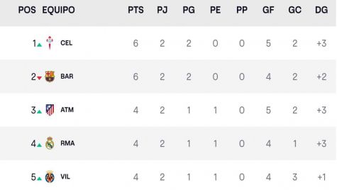 El FC Barcelona finalizó la fecha 2 de LaLiga EA Sports 2024-25 en la segunda posición de la tabla, siendo el Celta de Vigo y los de Hansi Flick los únicos con seis puntos ganados hasta ahora, pero el conjunto de Claudo Giráldez es primero por la diferencia de goles. El Real Madrid y el Atlético de Madrid vencieron 3-0 en sus respectivos encuentros, mientras que los culés se impusieron 2-1 al Athletic Club de Bilbao.