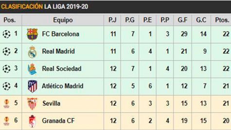 La clasificación liguera está ahora más igualada que nunca por la parte de arriba. El Barça, eso sí, se mantiene primero por la diferencia de goles, que es bastante superior a la de la Real y el Madrid. Los culés tienen 29 goles a favor, por 14 en contra, mientras que los madridistas se quedan segundos con su 21 y 9, y los vascos terceros con 20 y 13.