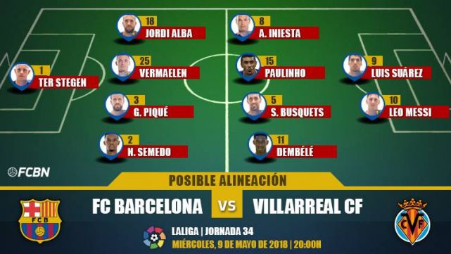 FC Barcelona: Ter Stegen; Semedo, Piqué, Vermaelen, Jordi Alba; Paulinho, Busquets, Iniesta, Dembélé; Messi y Suárez.