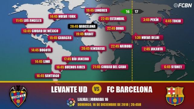 ¿Cuándo y dónde ver el partido Levante-FC Barcelona? Repasamos la guía internacional con los horarios y los canales de televisión que retransmiten en directo y online la jornada 16 de LaLiga Santander 2018-2019. En España, puedes ver el partido Levante-Barcelona el domingo 16 de diciembre a las 20:45 horas