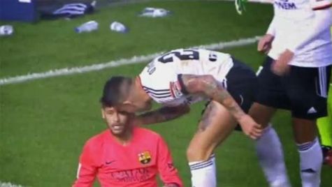 El central del Valencia, Otamendi, fingió una agresión de Neymar justo después de increparle que se había tirado a la piscina en la jugada anterior. Tras el ligero roce con la cabeza del brasileño, el argentino cayó rodando como si le hubieran disparado
