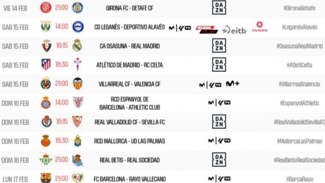 En esta jornada liguera, entre otros duelos, el Real Madrid se cruzará el sábado 15 de febrero al CA Osasuna a las 16:15 h en El Sadar. Por otro lado, en esa misma jornada sabatina, pero a las 18:30 h, el Atlético de Madrid recibirá al Celta de Vigo en el Metropolitano.