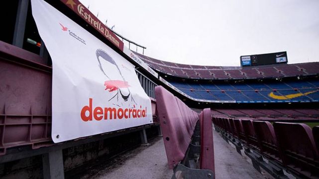 Tal y como ha informado además el director de partido de LaLiga, al parecer la persona que invadió el campo "se encontraba previamente acompañada de otras dos, perteneciendo todas ellas según información facilitada por dichas personas a 'Ómnium Cultural', quienes se habían desplazado a esa ubicación con autorización del Club para colocar una pancarta con un dibujo de un rostro con una línea roja y el lema "democracia"".