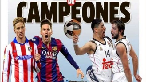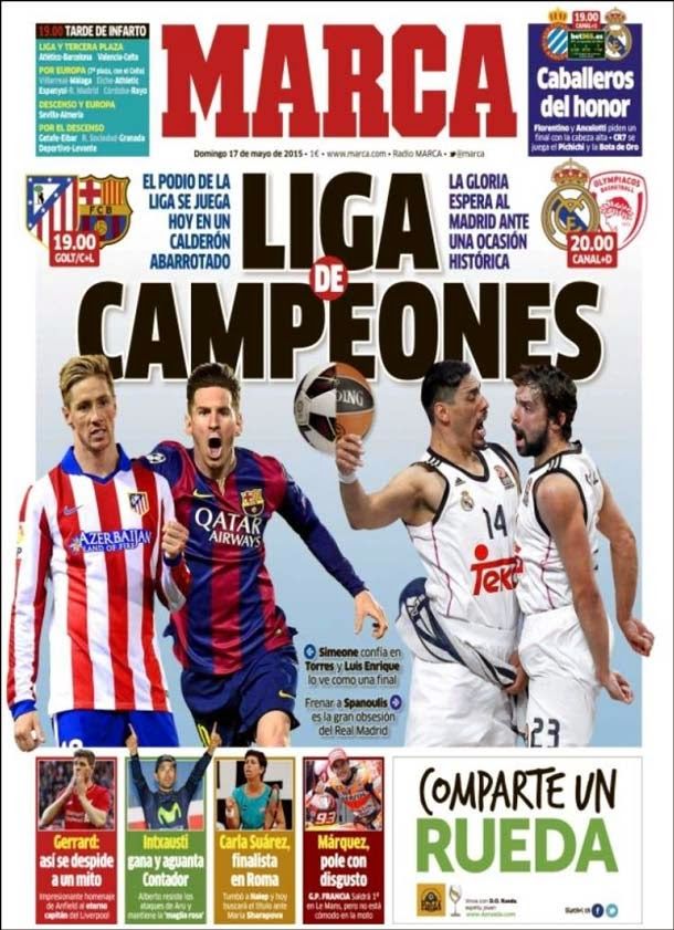 Portada del periódico Marca, domingo 17 de mayo de 2015. El podio de la Liga se juega hoy en un Calderón abarrotado. Simeone confía en Torres y Luis Enrique lo ve como una final.