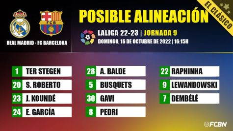 Sergi Roberto es otra alternativa para la banda y, de resto, son pocas las preguntas de Xavi. En la línea de ataque, Robert Lewandowski y Ousmane Dembélé parten como titulares indiscutibles, pero el otro extremo está por decidirse. Hasta ahora, Raphinha ha sido titular en los partidos más importantes, pero contra el Inter, más allá del balón que puso para el primer gol, estuvo desarcetado e incómodo. Ansu puede ser la alternativa. A continuación, nuestra previsión de las alineaciones para el Clásico: