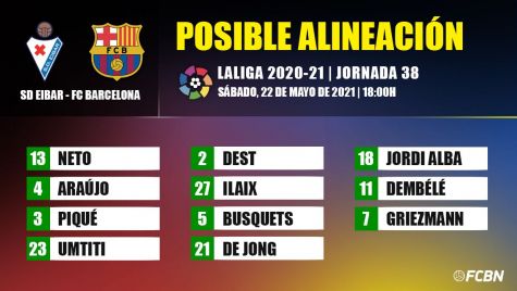 En los últimos partidos, Koeman había probado a Ousmane Dembélé como carrilero derecho y los resultados fueron buenos, pero frente al Eibar se espera que Sergiño Dest regrese a la titularidad y el francés suba al ataque. Así pues, Dest y Jordi Alba serán los encargados de abrir el juego por las bandas y así potenciar la ofensividad del equipo, mientras que en la medular estarán Ilaix Moriba, Sergio Busquets y Frenkie de Jong. El canterano reemplazará a Pedri, que ya se ha marchado de vacaciones, aunque también hay opciones de que Riqui Puig sea titular.