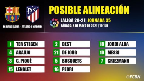 - XI del FC Barcelona: Ter Stegen; Araujo, Piqué, Lenglet; Dest, De Jong, Busquets, Pedri, Jordi Alba; Messi y Griezmann.
