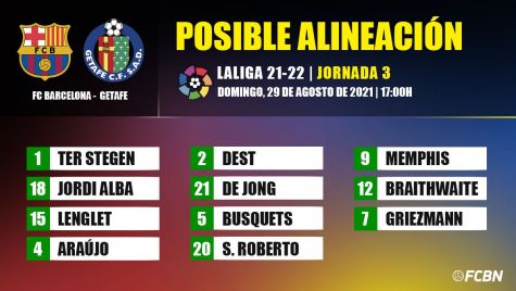 - XI del FC Barcelona: Ter Stegen; Dest, Araújo, Lenglet, Alba; S. Roberto, Busquets, De Jong; Griezmann, Braithwaite y Memphis.