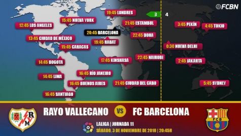 En España, el Rayo-Barça será televisado en directo el sábado 3 de noviembre a las 20:45 horas por los canales Movistar Partidazo (canal 46 de Movistar ), M. Partidazo UHD y Movistar Partidazo 4K (canal 440 de Movistar ) y LaLiga TV (Bar), a través de los operadores Movistar , Vodafone, Orange y Telecable, que ofrecerán también el partido en Internet y con acceso desde cualquier PC/MAC, tablet o smartphone. Además, diferentes canales internacionales ofrecen ver el Rayo-Barcelona de la undécima jornada de LaLiga en directo a través de sus plataformas.