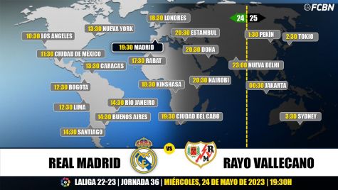 Real Madrid y Rayo Vallecano se enfrentan este miércoles 24 de mayo a las 19:30 horas (7:30 PM CEST) en el estadio Santiago Bernabéu (Madrid). El encuentro corresponde a la jornada 36 de LaLiga Santander 2022-2023 y enfrenta al Madrid de Carlo Ancelotti (tercero en la clasificación con 71 puntos) y al Rayo de Andoni Iraola (undécimo en Laliga con 46 unidades). A continuación, repasamos los horarios y dónde ver este partido de fútbol en TV.