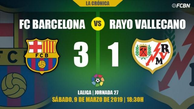 El FC Barcelona sumó una nueva victoria tras superar al Rayo Vallecano en el Camp Nou por 3-1. Los de Valverde sufrieron más de lo debido y empezaron perdiendo por un gol de Raúl de Tomás. Piqué, Messi de penalti y Luis Suárez le dieron la victoria al Barça