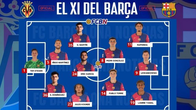 - XI titular del FC Barcelona: Ter Stegen; Koundé, S.Domínguez, Iñigo Martínez, Gerard Martín; Pablo Torre, Pedri, Eric García; Raphinha, Lewandowski y Lamine Yamal.
