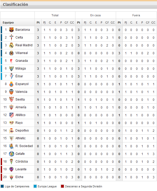 Clasificación de la Liga BBVA 2014-2015 - Jornada 1