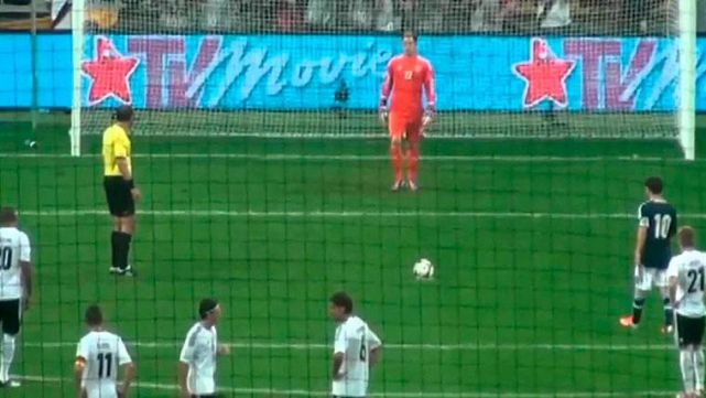 A la media hora de partido el meta Zieler fue expulsado al cometer un penalti sobre Higuaín y Ter Stegen se ponía en su puesto. Lionel chutaba desde los once metros y el guardameta, que por aquel entonces no compartía equipo con él, adivinó sus intenciones para pararlo. Finalmente el partido acabó con victoria albiceleste por uno a tres dada la inferioridad, pero esa intervención servía para mantener momentáneamente el cero a cero en el luminoso