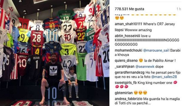 Leo Messi ha colgado este martes en su Instagram una espectacular colección de camisetas. El astro argentino aparece sentado en la imagen junto a su hijo Thiago y una treintena de elásticas con míticos como Aimar, su ídolo, o Diego Milito