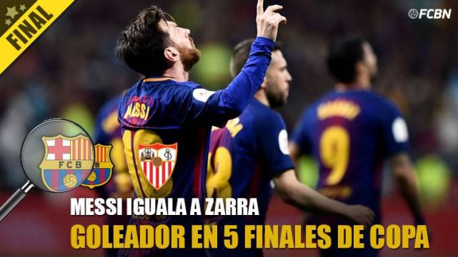 La gran estrella del FC Barcelona, Leo Messi, igualó este sábado el récord de Telmo Zarra al marcar en cinco finales de la Copa del Rey, algo que no había conseguido nadie más desde hacía 68 años. El '10' anotó uno de los goles del Barça ante el Sevilla