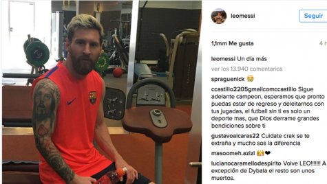 El astro argentino del FC Barcelona, Leo Messi, continúa realizando ejercicios de rehabilitación en el gimnasio de la Ciutat Esportiva de Sant Joan Despí, incluso cuando el resto de la plantilla está concentrada con sus selecciones o bien tiene descanso.