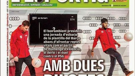 Portada del periódico L´Esportiu, viernes 28 de noviembre de 2014. El buen ambiente preside una jornada de recreo de la plantilla del Barça antes de afrontar retos vitales como el partido del domingo en Valencia, el derbi y el duelo contra el PSG.