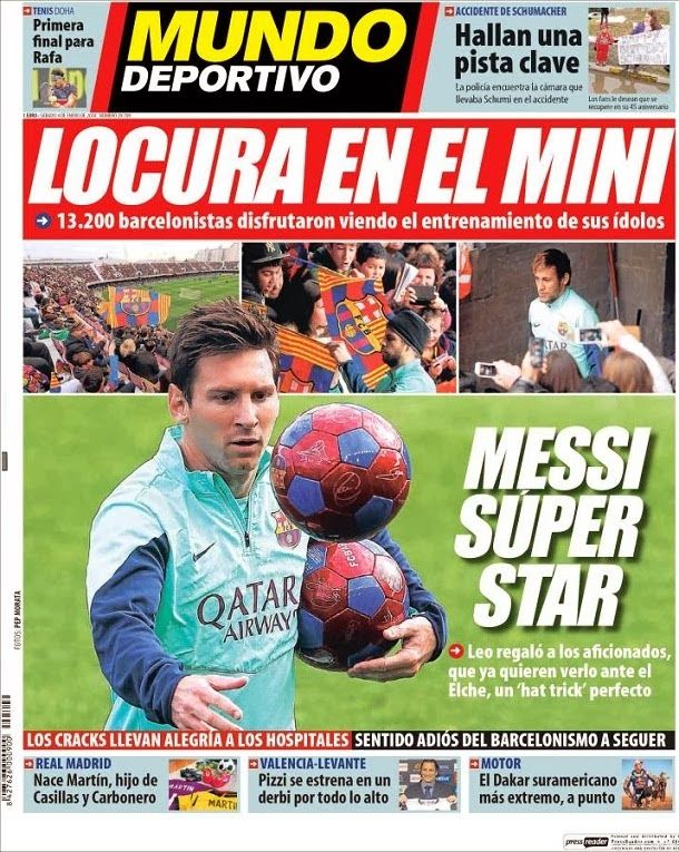 Portada Mundo Deportivo, sábado 4 de enero de 2014. "Messi Súper Star". Leo regaló a los aficionados, que ya quieren verlo ante el Elche, un "hat-trick" perfecto. | Locura en el Mini. 13.200 barcelonistas disfrutaron viendo el entrenamiento de sus ídolos. | Los cracks llevan la alegría a los hospitales. | Sentido adiós del barcelonismo a Seguer. | Real Madrid. Nace Martín, hijo de Iker Casillas y Sara Carbonero.