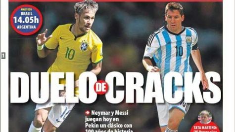 Portada Mundo Deportivo, sábado 11 de octubre de 2014. Neymar y Messi juegan hoy en Pekín un clásico con 100 años de historia. Brasil y Argentina jugarán la final soñada que no se vio en la Copa del Mundo (14:05, Esport3). Luis Suñarez "fabricó" un gol. El barcelonista jugó 69 minutos en un partido serio en el que se le notó la falta de ritmo y competición.
