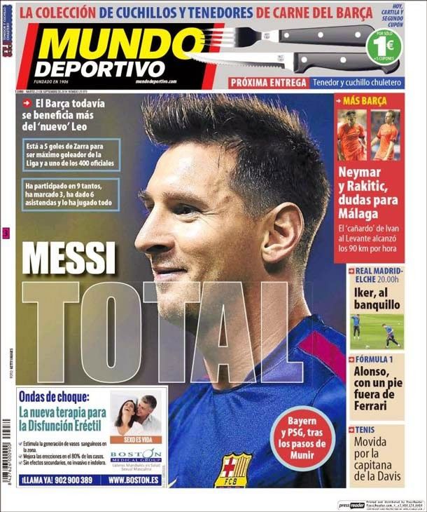Portada Mundo Deportivo, martes 23 de septiembre de 2014. El Barça todavía se beneficia más del "nuevo" Leo. Está a 5 goles de Zarra para ser el máximo goleador de la Liga y a uno de los 400. Ha participado en 9 tantos, ha marcado 3, ha dado 6 asistencias y lo ha jugado todo.