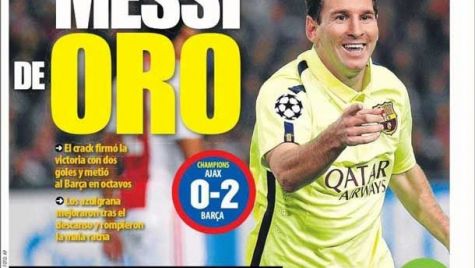 Portada Mundo Deportivo, jueves 6 de noviembre de 2014. Leo caza a Raúl y supera a Cristiano. El crack firmó la victoria con dos goles y metió al Barça en octavos. Los azulgranas mejoraron después del descanso y rompieron la mala racha.
