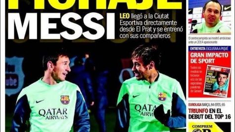 Portada Sport, viernes 3 de enero de 2014. "Fichaje Messi". Leo llegó a la Ciutat Esportiva directamente desde El Prat y se entrenó con sus compañeros. | ¡Bienvenido! Neymar recibió al crack argentino con cariño y pronto podrán jugar juntos. | Iniesta: "Un buen año sería ganarlo todo" | Valdés ya tiene el alta médica y podrá jugar el domingo.