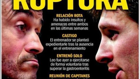 Portada del periódico Sport, miércoles 7 de enero de 2015. Luis Enrique y Messi ni se hablan. Ha habido insultos y amenazas entre ambos en las últimas semanas. El entrenador se planteó expedientarle tras la ausencia en el entrenamiento.
