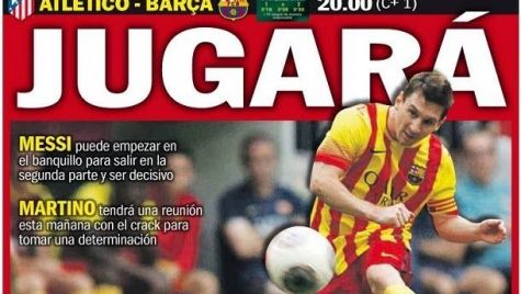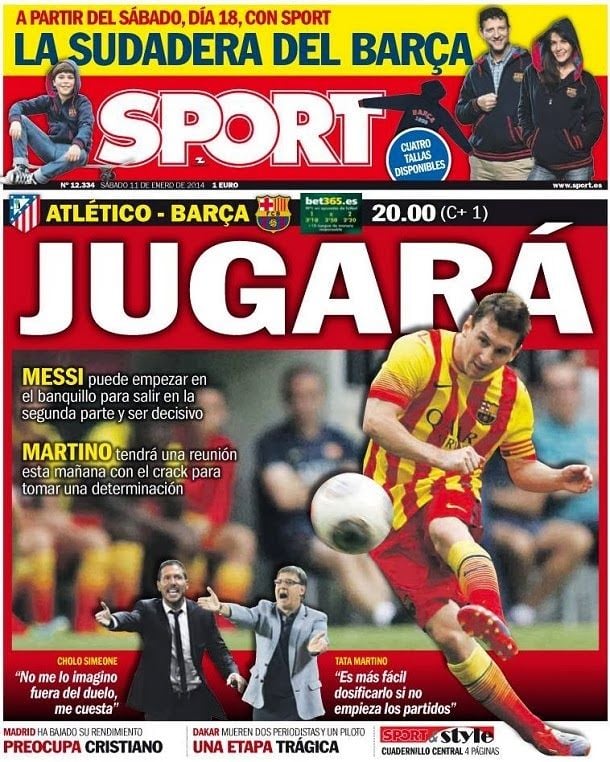 Portada Sport, sábado 11 de enero de 2014. "Jugará". Atlético-Barça (20.00 horas C 1). Messi puede empezar en el banquillo para salir en la segunda parte y ser decisivo. Martino tendrá una reunión esta mañana con el crack para tomar una determinación. | Preocupa Cristiano Ronaldo. El portugués ha bajado su rendimiento.