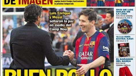 Portada del periódico Sport, lunes 25 de mayo de 2015. Luis Enrique y Leo Messi sellaron la paz en medio del Camp Nou. El Barça cambia de imagen.
