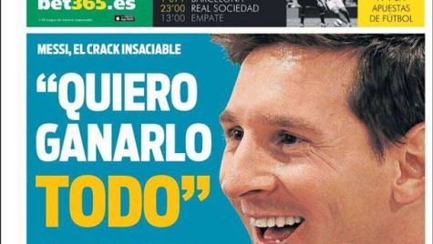 Portada del periódico Sport, sábado 28 de noviembre de 2015. Messi, el crack insaciable. Leo será titular ante la Real Sociedad (16.00H) con el objetivo de cerrar una semana perfecta.