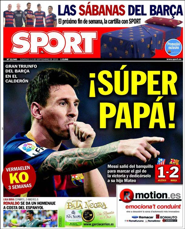 Portada del diario Sport, domingo 13 de septiembre de 2015. Gran triunfo del Barça en el Calderón 1-2: Messi salió desde el banquillo para marcar el gol de la victoria y dedicárselo a su hijo Mateo.