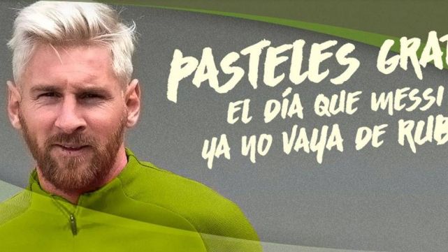 "Pasteles gratis cuando Messi se quite el color rubio de su pelo y vuelva a su color natural", utiliza como reclamo La Costarriva, marca de cafeterías y pastelerías catalana que nació en Reus. Una divertida iniciativa que busca, por un lado, aumentar su clientela y por otro, que Leo Messi recapacite y vuelva a ponerse el color del pelo oscuro, como siempre lo ha tenido.